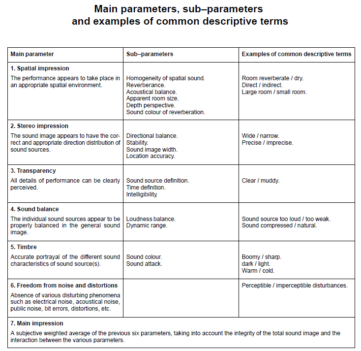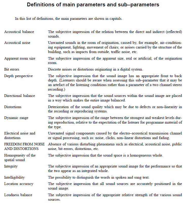 Parameters for assessing a phantom acoustic sceneIt is difficult to describe an aural scene without a common language and understanding of terms. The PEQS CD provides examples for each of the parameters below.